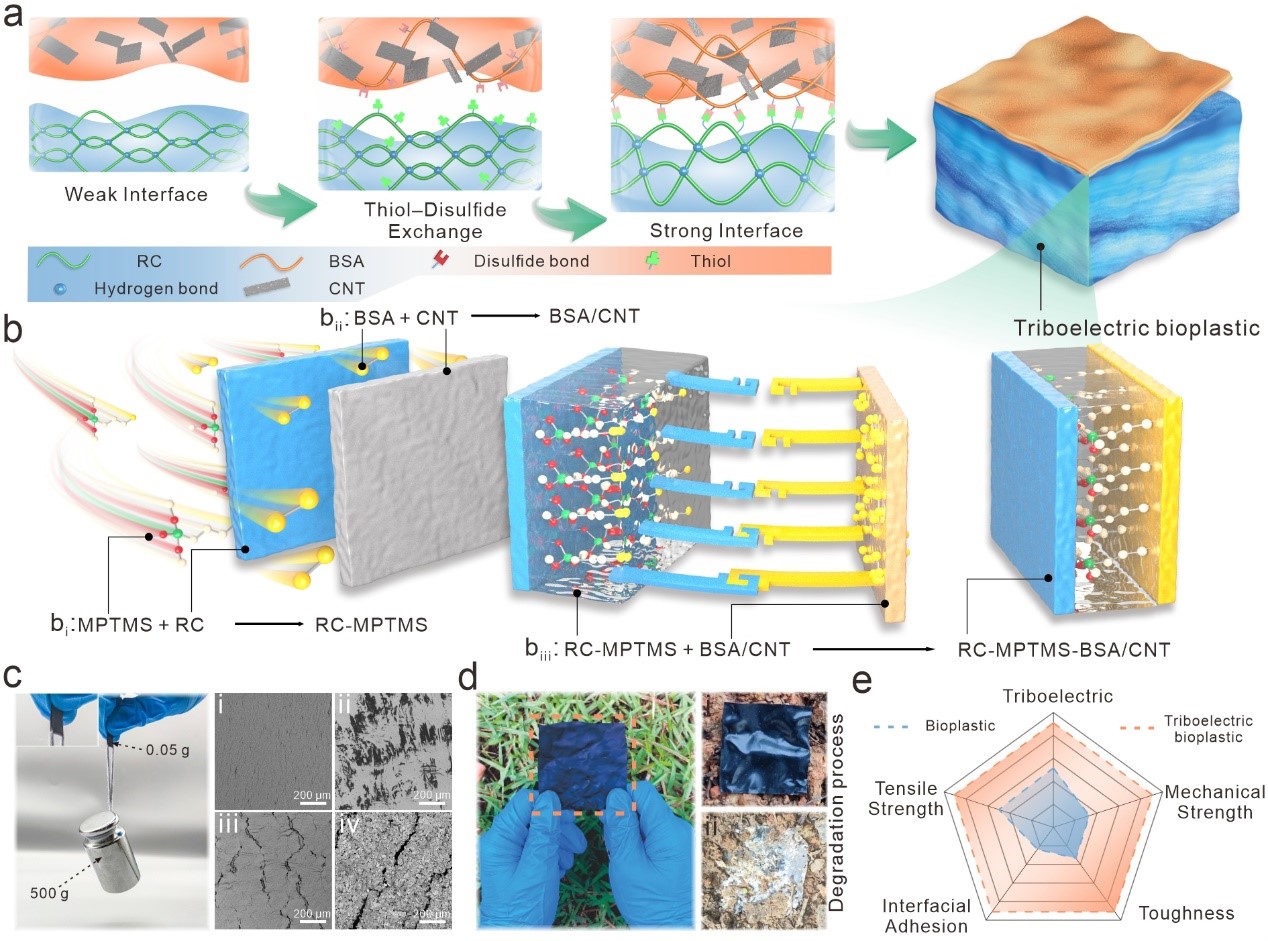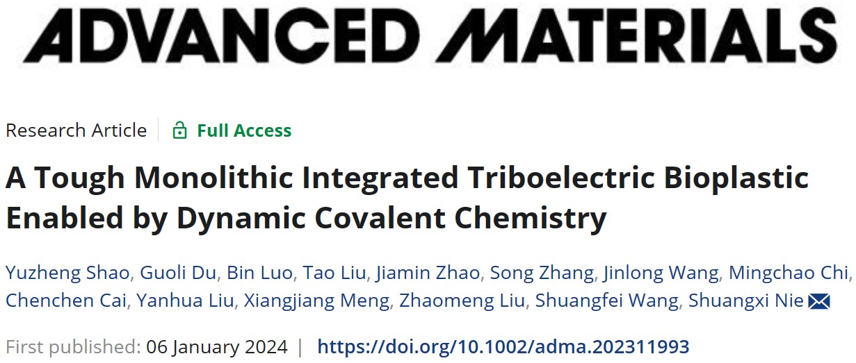 近日,我院王双飞院士团队“先进木质纤维材料”课题组基于纤维素优异的可降解性和摩擦电特性,通过动态共价化学方法构建了一种坚固的摩擦电生物塑料,解决了绿色电子产品中聚合物基材与导电涂层界面易剥离破碎的难题。该研究成果以“A Tough Monolithic Integrated Triboelectric Bioplastic Enabled by Dynamic Covalent Chemistry”为题发表于材料领域国际顶级期刊《Advanced Materials》上,我院为该成果的唯一完成单位,2021级硕士研究生邵宇正为第一作者,聂双喜教授为通讯作者。