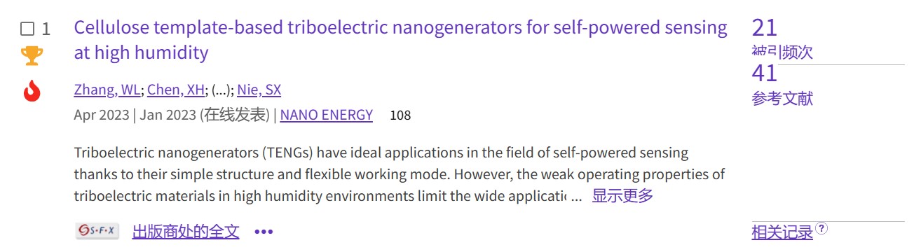 【热点论文2】轻工技术与工程专业2020级硕士研究生张旺林等人以天然纤维素为模板制备了亲水性摩擦电材料,为高湿环境下实时自供电传感提供可持续输出。模板化过程中纤维素与湿敏材料的协同作用提高了材料的亲水性。该摩擦电材料具有高灵敏度(0.8/1%)和高稳定性(150 s)的良好性能,能够在高湿环境下进行可视化湿度传感。相关研究成果于2023年1月10日以题为“Cellulose template-based triboelectric nanogenerators for self-powered sensing at high humidity”在线发表于《Nano Energy》。论文链接:https://www.sciencedirect.com/science/article/pii/S2211285523000320