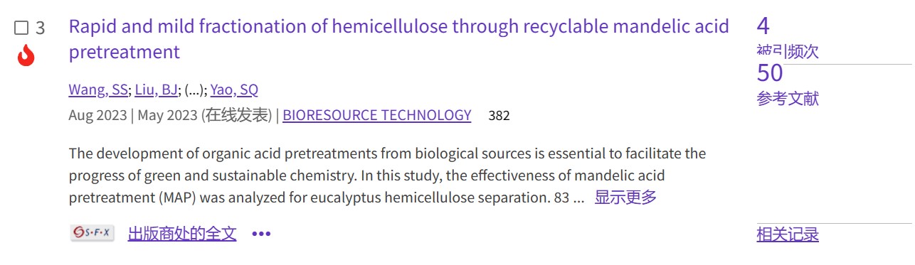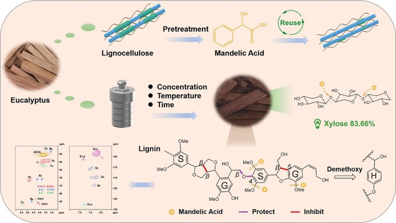 【热点论文5】材料与化工专业2021级硕士研究生王珊珊等人开发了扁桃酸预处理技术,实现了对桉木半纤维素的高效分离。扁桃酸水解液经过6次重复使用后,其分离效率仍稳定有效。样品具有较高的热稳定性、较高的结晶度和优异的表面元素分布。从不同木质素的结构可以看出,扁桃酸有效地抑制了木质素的缩聚。特别是发现了扁桃酸对木质素的去甲氧基化作用。为构建高效分离半纤维素的新型有机酸预处理开辟了一条新途径。相关研究成果于2023年5月10日以题为“Rapid and mild fractionation of hemicellulose through recyclable mandelic acid pretreatment ”在线发表于《Bioresource Technology》。论文链接:https://www.sciencedirect.com/science/article/pii/S0960852423005801