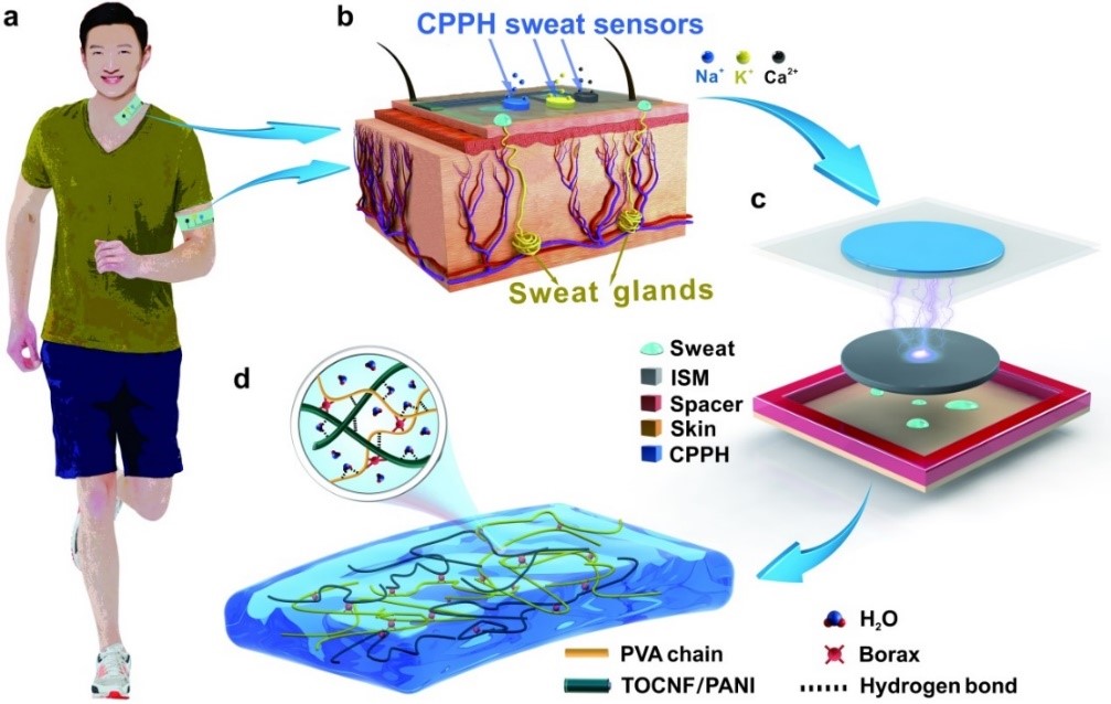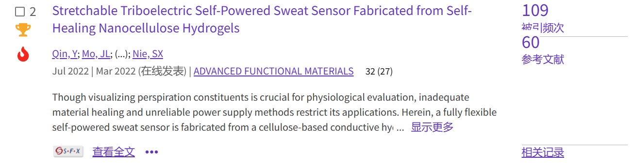 【热点论文1】制糖工程专业2018级博士生秦影等人开发了一种可快速自愈合的纤维素基导电水凝胶电极,用于全柔性的自供电汗液传感器。通过选择性的捕捉汗液中的特定离子(钾、钙和钠离子),使其参与并调控运动能转化为电能的过程,实现了对人体状态的可视化实时监测。相关研究成果于2022年3月31日以题为“Stretchable Triboelectric Self-Powered Sweat Sensor Fabricated From Self-Healing Nanocellulose Hydrogels”在线发表于《Advanced Functional Materials》。值得一提的是,该论文已是第二次入选ESI热点论文,其影响力可见一斑。论文链接:https://onlinelibrary.wiley.com/doi/full/10.1002/adfm.202201846
