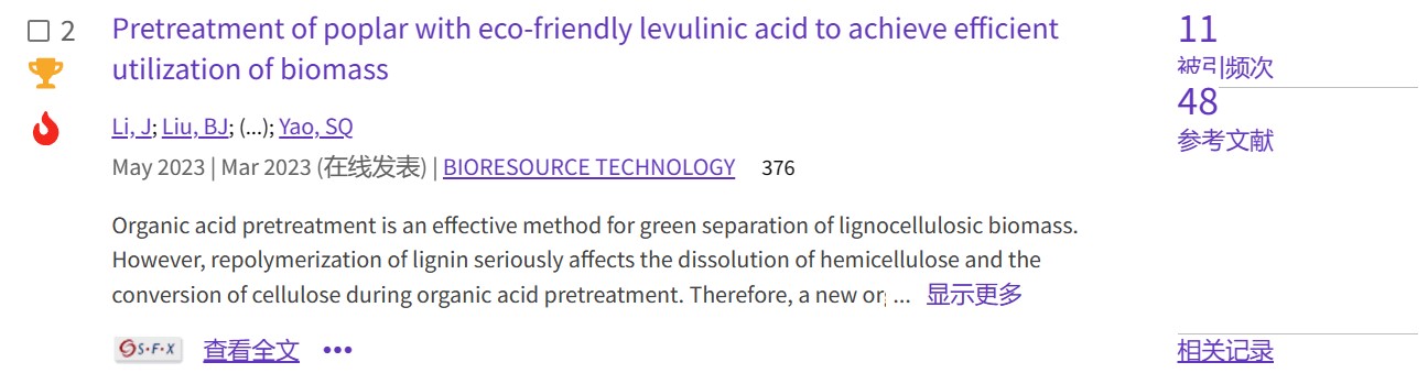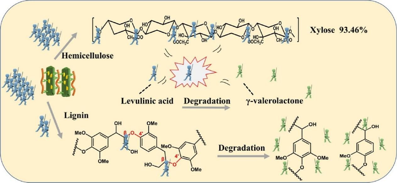 【热点论文4】材料与化工专业2021级硕士研究生李娇等人开发了一种新的有机酸预处理—乙酰丙酸预处理,在不添加其他添加剂的情况下对木质纤维素生物质进行解构,成功实现了半纤维素的高效优先分离。并且在半纤维素的高效优先分离过程中,由于γ-戊内酯的溶解作用,木质素的再聚合被有效抑制。研究结果为建立绿色高效有机酸预处理和有效抑制木质素再聚合提供了理论支持。相关研究成果于2023年2月5日以题为“Pretreatment of poplar with eco-friendly levulinic acid to achieve efficient utilization of biomass”在线发表于《Bioresource Technology》。论文链接:https://www.sciencedirect.com/science/article/pii/S096085242300281X