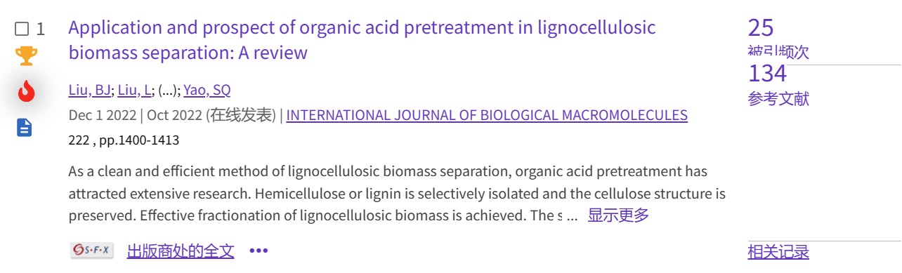 【热点论文3】轻工技术与工程专业2020级博士研究生刘宝杰等人综述了不同有机酸对半纤维素和木质素的分离特性。根据分离机理,将半纤维素有机酸分离为氢离子酸、自催化酸和α-羟基酸。木质素的分离取决于有机酸的溶解机理和空间效应。此外,还分析了有机酸预处理面临的挑战和前景,对未来有机酸预处理技术的发展提供了指导意见。相关研究成果于2022年10月1日以题为“Application and prospect of organic acid pretreatment in lignocellulosic biomass separation: A review”在线发表于《International Journal of Biological Macromolecules》。论文链接:https://www.sciencedirect.com/science/article/pii/S0141813022022103