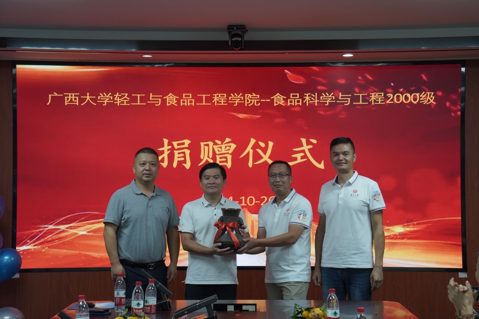 参观游览完校园,校友们邀请学院领导及食品系教师在学院二楼会议室举行座谈交流会。会上,学院院长覃程荣向校友们介绍了学院发展状况及未来建设发展方向,学院党委书记姜玮代表学院向各位校友的返校表示热烈欢迎,表示学院永远是校友们的温馨港湾,学院将一如既往地支持和关注校友们的成长。食品2000级校友为了表示对学院的感谢,向学院捐赠万象更新瓶,寓意学院“万象更新,欣欣向荣”。