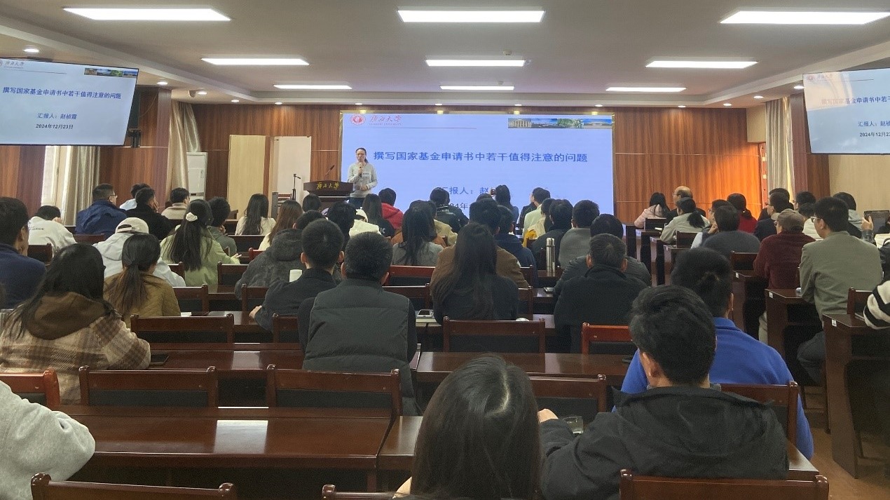为了给我院教师提供国家自然科学基金申报指导,助力学院科研发展。12月23日下午,我院举办“2025年度国家自然科学基金申报经验交流会暨2025年国基申报动员会”。本次会议邀请赵祯霞教授作为主讲嘉宾,覃程荣院长出席会议并致辞。会议由陆登俊副院长主持。