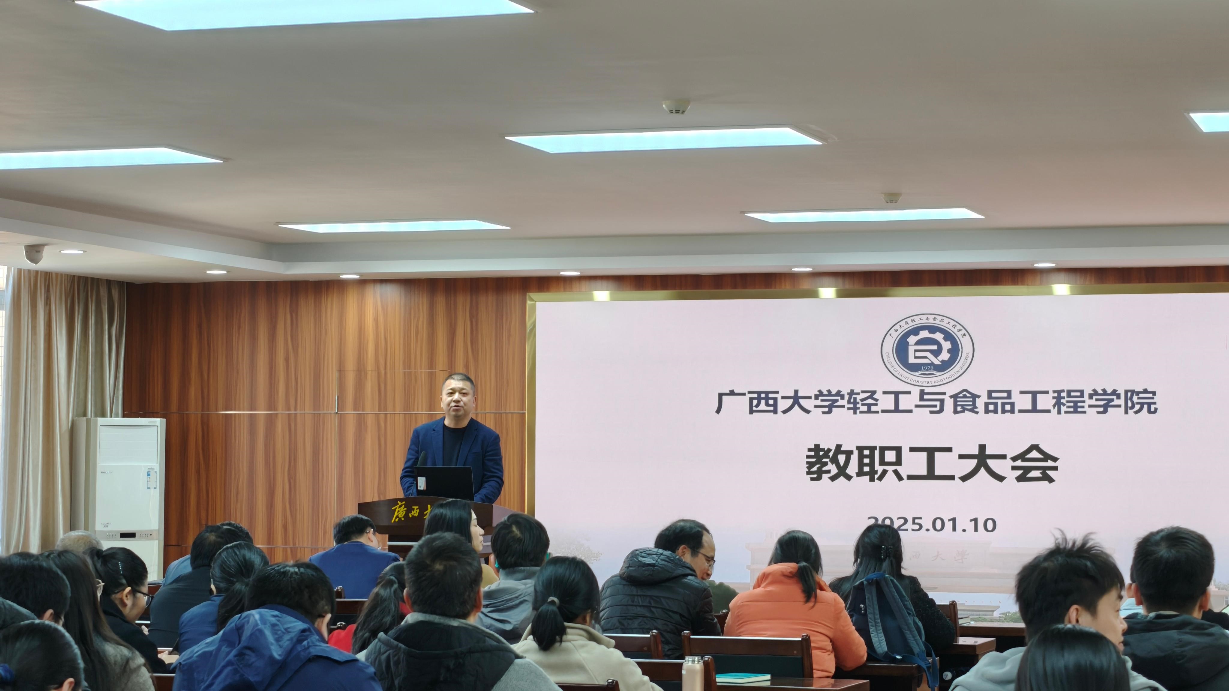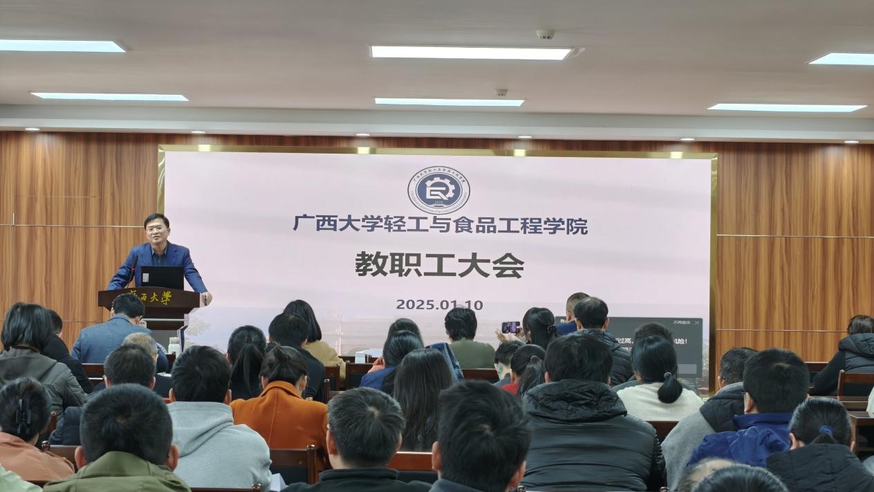 会上,覃程荣院长围绕学院2024年主要指标完成情况和各项工作的亮点进行了总结汇报。他指出,在过去一年,全院教职工团结奋进,在党建、学科建设、科学研究、人才培养、队伍建设等方面都取得了新的突破,学院整体实力稳步提升。同时,覃程荣院长对2025年重点工作进行了部署,从党建与业务高质量融合、专业和课程建设、学生培养、人才队伍建设、学科建设、高水平科研成果以及实验室安全管理等方面提出了具体要求,并再一次明确了学院发展规划长期目标。为学院发展立好标杆、定好目标,鼓励全体教职工继续发扬团队精神、积极创新,为学院高质量发展贡献力量。