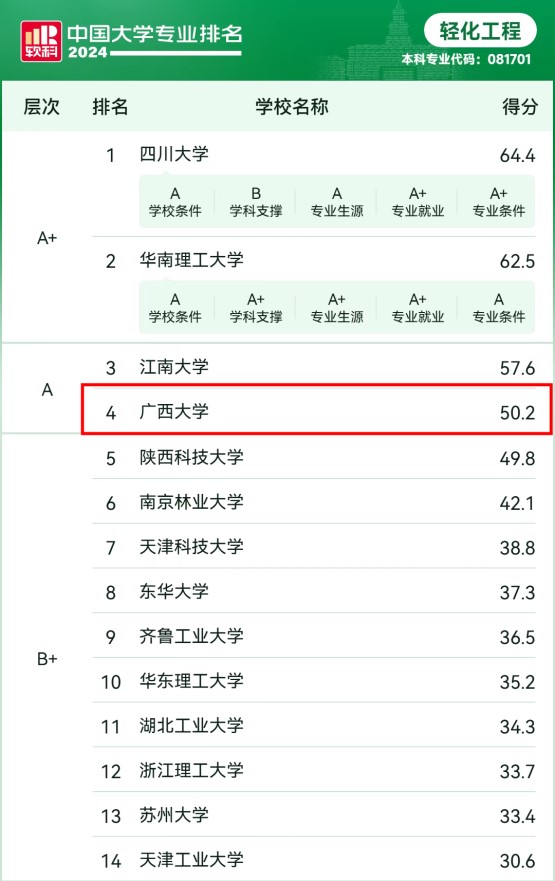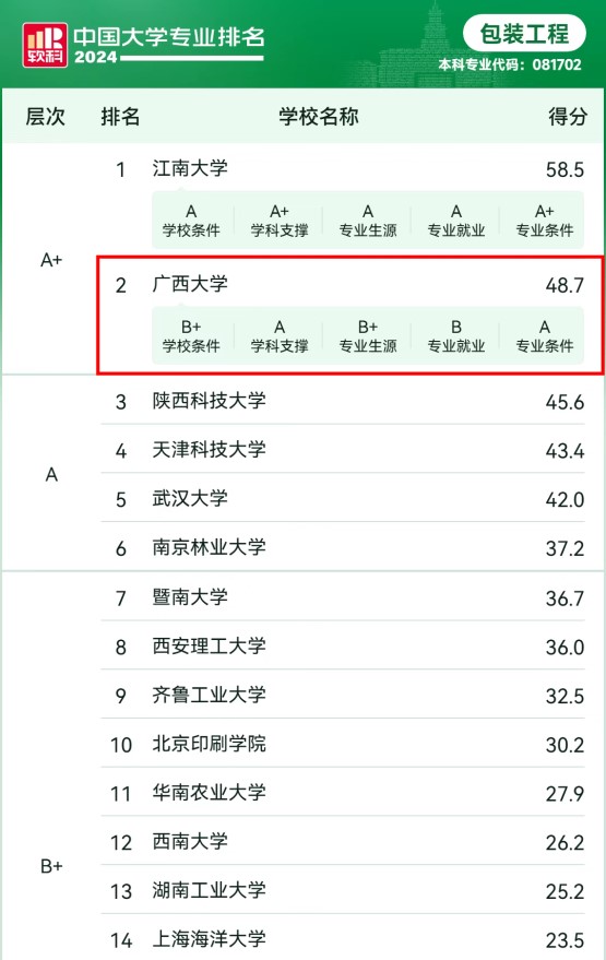 6月13日,高等教育专业评价机构软科发布“2024年软科中国大学专业排名”,我院两个专业跻身国内顶尖行列,包装工程专业位列全国第2、轻化工程专业位列全国第4,评级分别为A+和A。