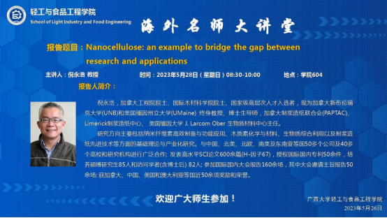 2023年5月28日上午,不卡毛无套内射久久不欧美日韩国产在线海外名师大讲堂系列讲座在学院604顺利举办。美国缅因州立大学化学生物工程学院教授,加拿大工程院院士倪永浩受邀开展了以“Nanocellulose : an example to bridge the gap between research and applications ”为题的学术报告,报告由覃程荣院长主持。讲座吸引了学院众多老师、研究生、博士生前来聆听。