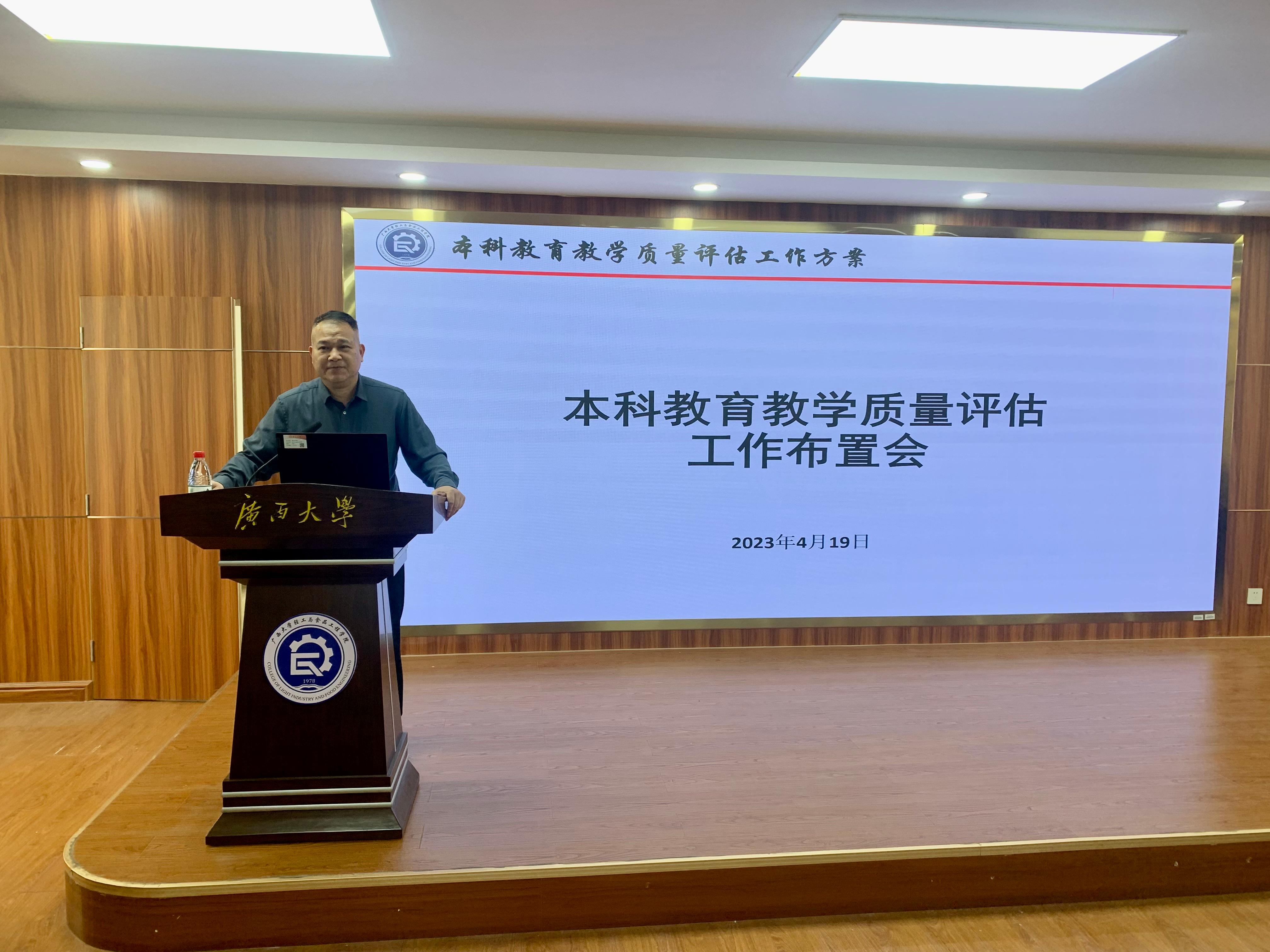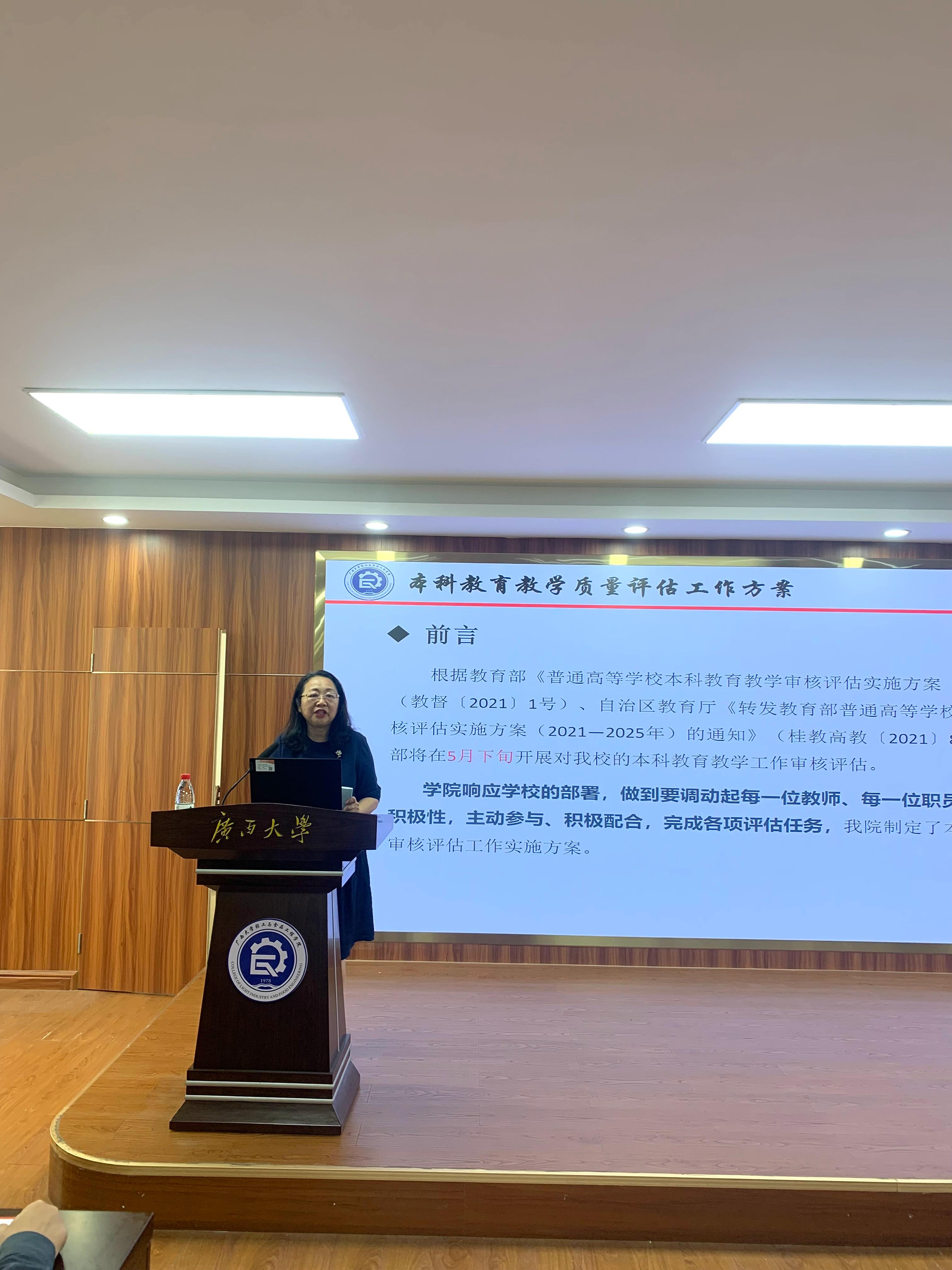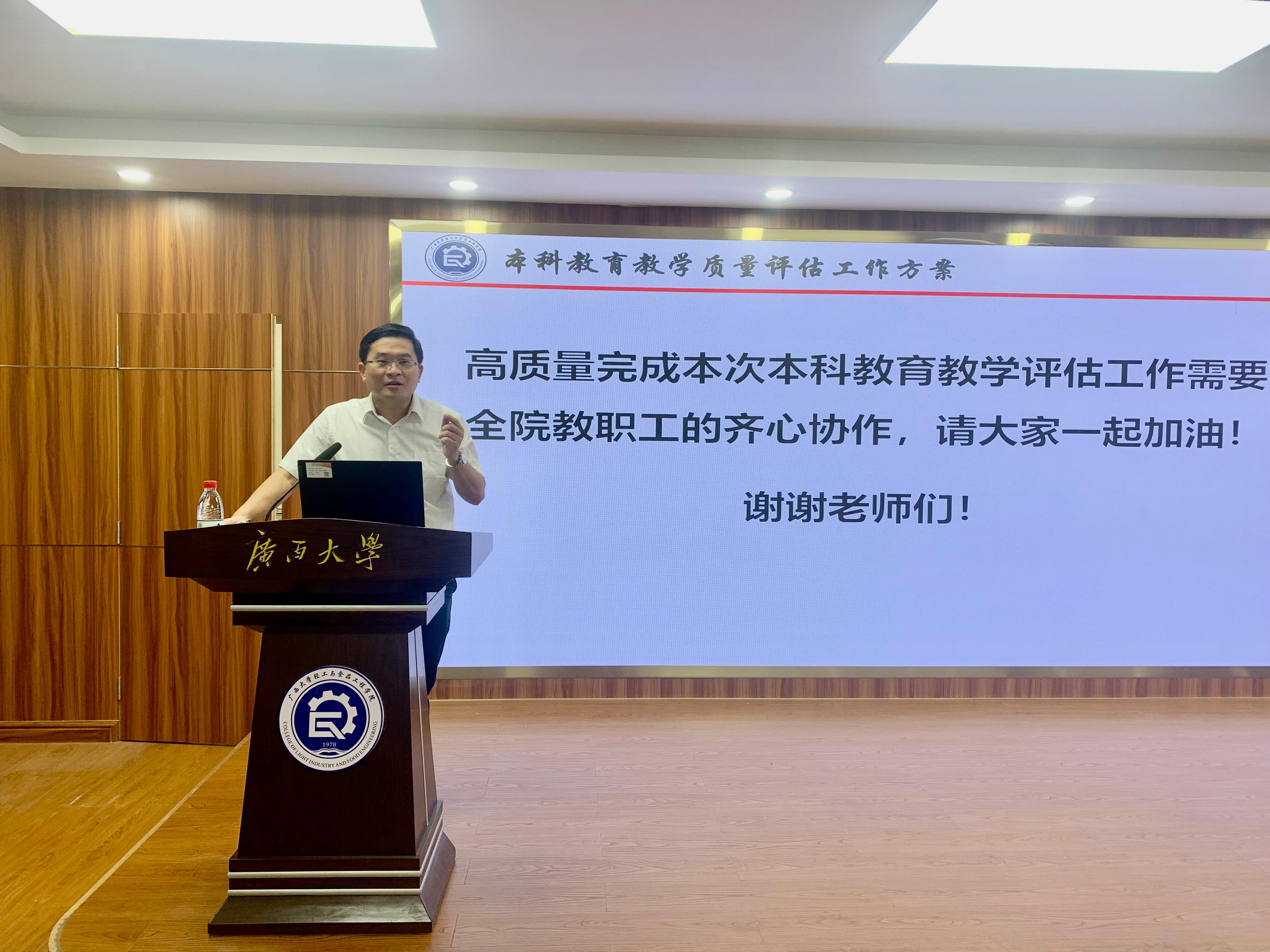 覃程荣院长强调,高质量完成本次本科教育教学评估工作需要全院教职工的齐心协作,全院教师要在思想上高度重视,行动上严格落实,积极配合、强化协作,扎实做好各项教学材料的准备工作。全体师生要以“校荣我荣”的主人翁精神和责任感,参与到教育教学评估工作中来。