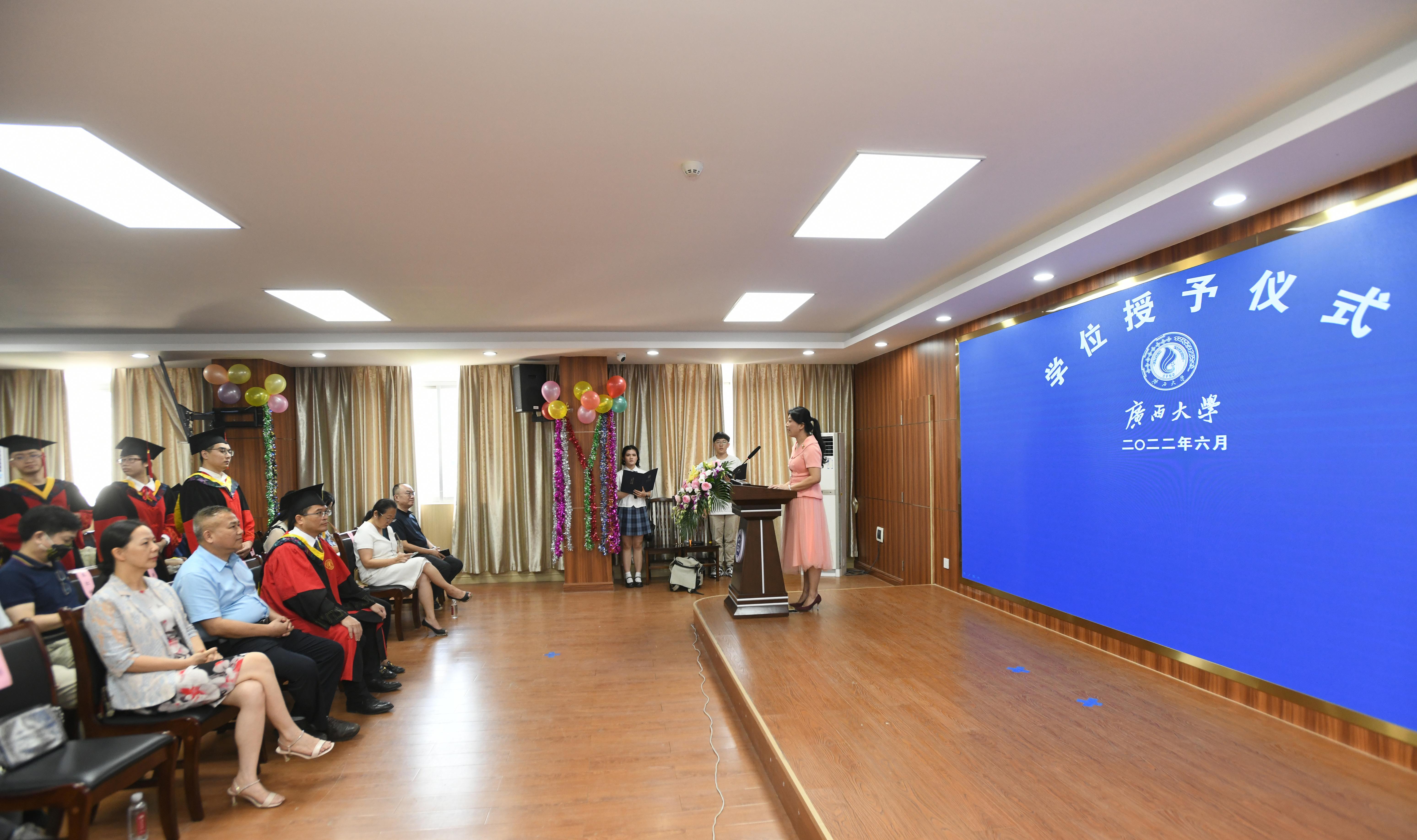 在学院分会场中,覃程荣为我院2022届毕业生实施拨穗礼,并颁发学位证书。