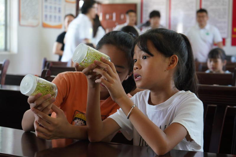科普活动现场,小朋友正在了解甘蔗脱毒健康种苗。王靖文摄