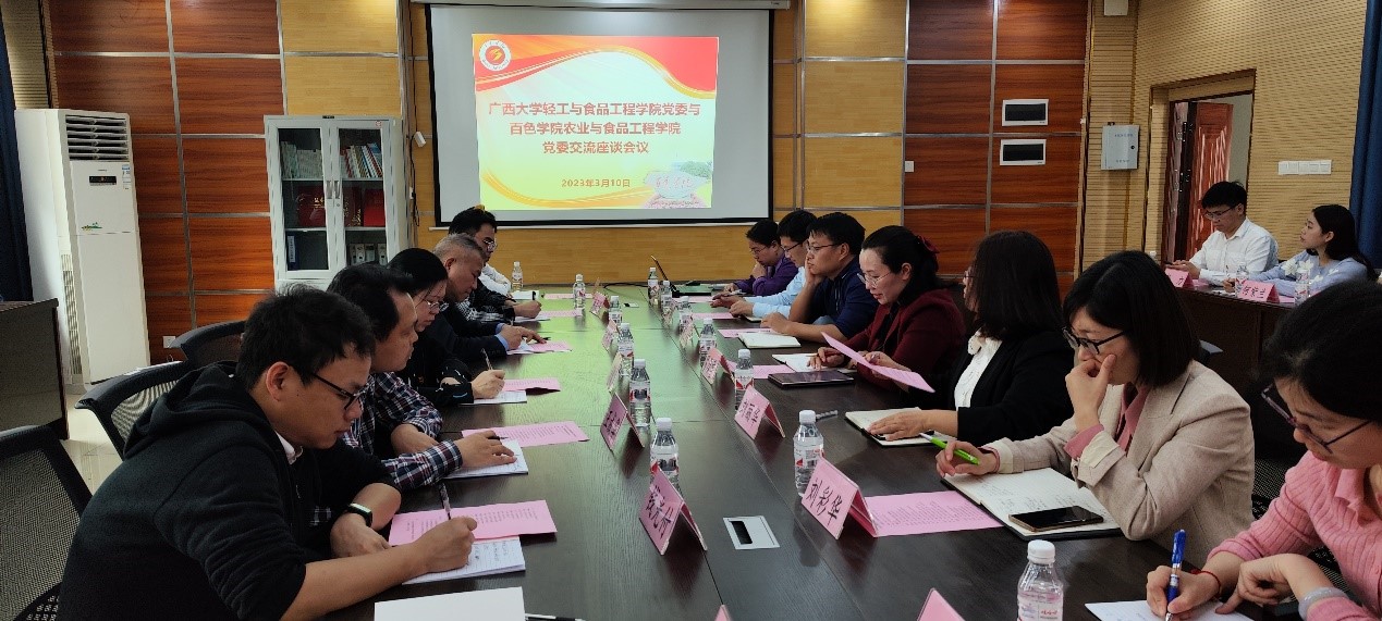 第三站,赴百色学院农业与食品工程学院座谈交流。首先,百色学院农业与食品工程学院党委书记刘丽华对学院党建工作做了简要介绍,她指出,一直以来,学院扎根红色土地,有针对性地开展党建品牌建设,取得了一系列标志性成果。随后,我院党委书记许树沛介绍了学院发展沿革、师资力量、教学科研、学生培养等基本情况。最后,我院制糖工程系教工党支部书记陆登俊对五星级党支部做了经验分享,重点介绍了党支部强基固本建设以及支部工作创新发展模式。自由交流阶段,双方就党建工作重点难点、党建引领学科建设、“党建+”等方面展开讨论。