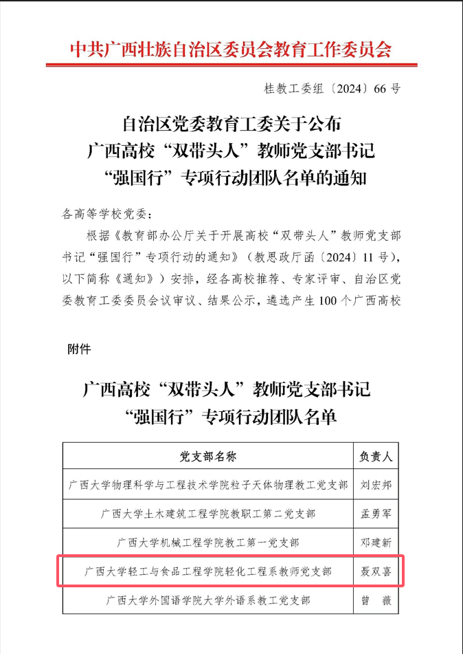 近日,自治区党委教育工委公布了全区高校“双带头人”教师党支部书记“强国行”专项行动团队入选名单,我院轻化工程系教师党支部入选广西高校“双带头人”教师党支部书记“强国行”专项行动团队。 “强国行”专项行动是教育部为创新落实立德树人根本任务,充分发挥高校“双带头人”示范引领作用,推进强国建设的重要举措。我院党委始终坚持以党建为引领,将党支部建设与教学科研、人才培养等中心工作紧密结合,不断提升教师党建工作的质量,实施“党建+”融合模式,促进党建与业务工作深度融合,全面推动学院高质量发展。