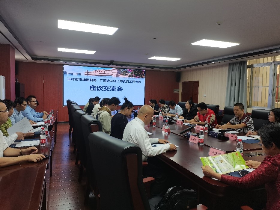 座谈交流会上,陆登俊副院长对玉林市市场监督管理局一行的来访表示欢迎,并介绍了学院学科专业建设发展历程、人才培养特色和近年科研代表性成果等方面的情况。莫萍局长介绍了玉林市近年食品行业的情况、研发过程中遇到的痛点难点问题及今后的合作设想。随后来访各企业负责人介绍了企业的基本概况、未来发展规划、合作需求等情况。随后校企双方就如何进一步推动校企合作、产品创新研发、项目联合申报等方面进行深入研讨。
