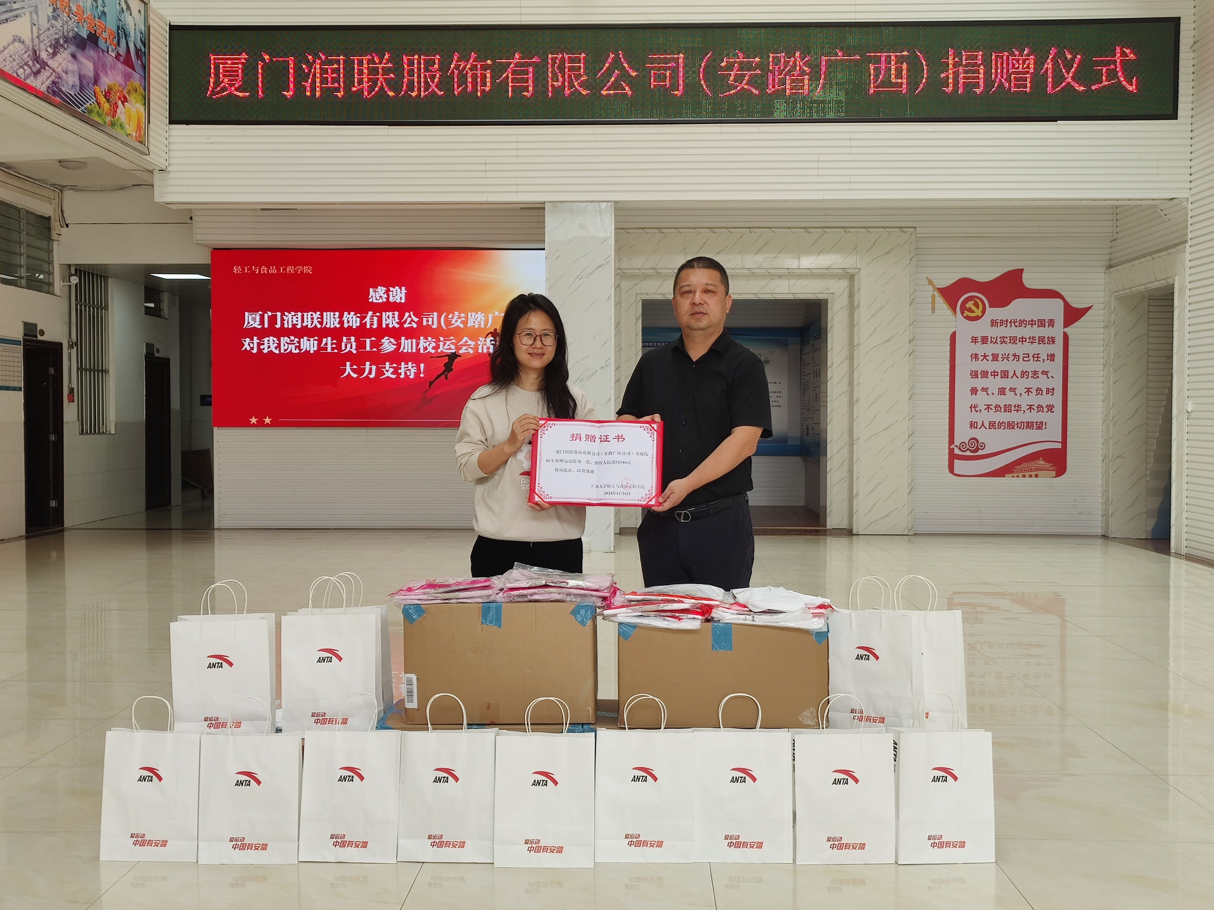 11月5日上午,一场充满温暖的捐赠活动在我院一楼中厅举行。厦门润联服饰有限公司(安踏广西公司)向我院捐赠了一批高品质的运动服,助力我院师生参加学校运动会活动。学院党委书记姜玮、安踏广西公司成人品牌事业部总监曾惺惺出席捐赠仪式。