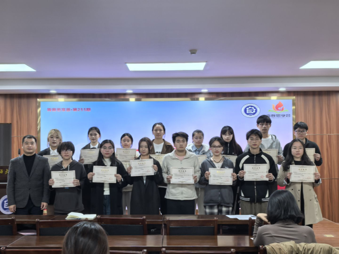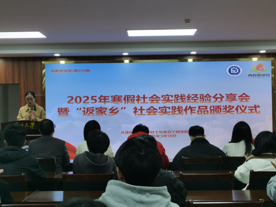 会议伊始,徐羽、卓能聪、刘宇三位老师为获奖学生颁发荣誉证书,并一同合影留念。随后,轻工242班张文静、李礼迎,24级研究生3班陈楚璇、张婉婷分别结合自身实践经历,分享他们在社会实践中的宝贵经验和深刻感悟。