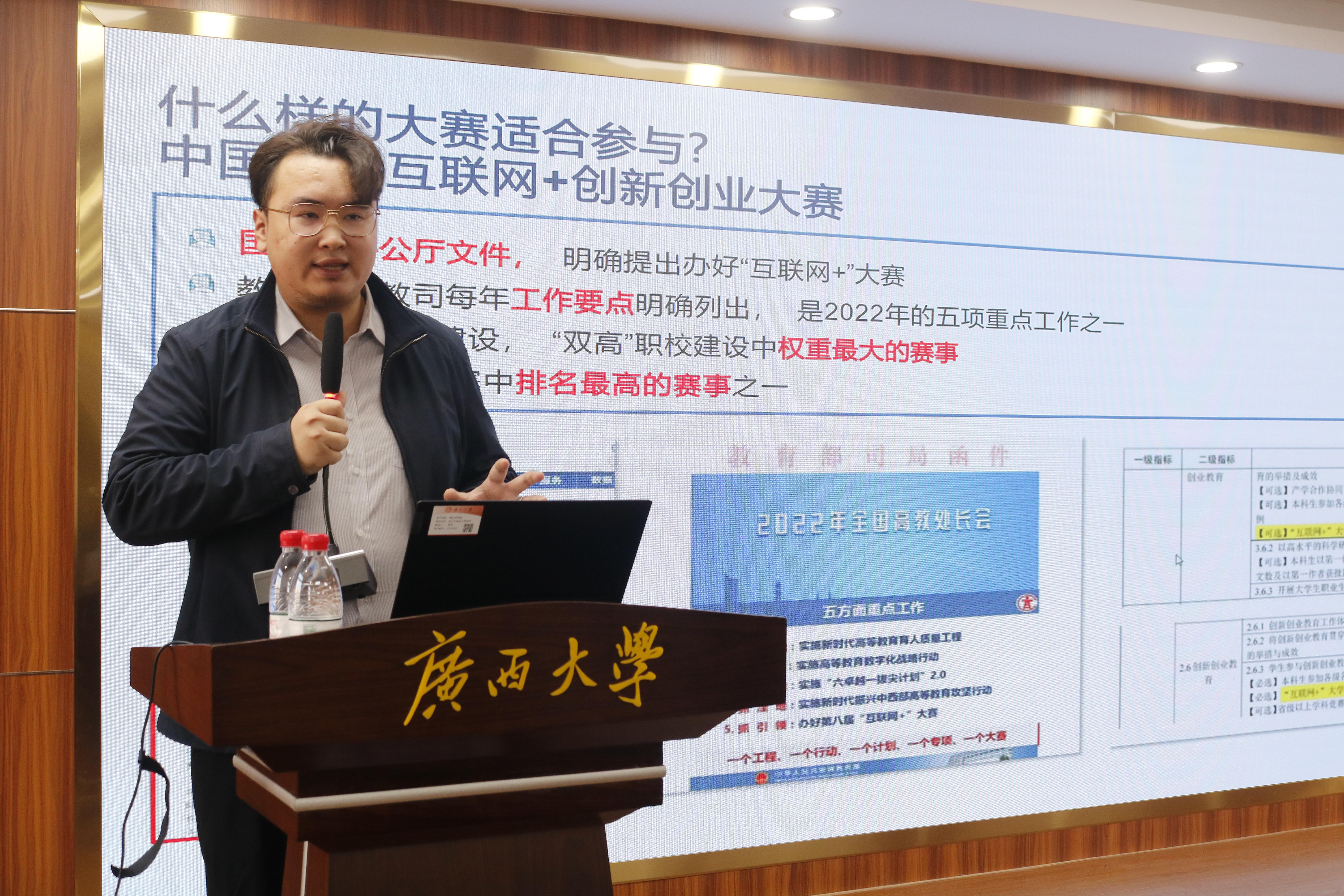 他指出,在“互联网+”大学生创新创业大赛中,要重视选题创新,富有差异化,围绕教学成果,产创结合,专创融合,学创融合,打磨好项目商业计划书。在 “挑战杯”全国大学生课外学术科技作品竞赛、“挑战杯”中国大学生创业计划竞赛中,需注重实践与理论相融合,致力于自发创新,自主创业,重视科研立项和产教结合。同时,在团队组建和合作交流方面,要着重考虑团队成员间的默契度以及各自的分工合作。