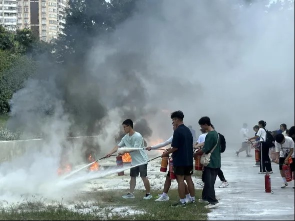 随后进行的是灭火实操演练。在专业人员的指导下,同学们一提,一拔,一握,一压,快速掌握了灭火器的正确使用技巧。在演练过程中,大家纷纷表示,通过亲身体验,对消防安全有了更深刻的认识。