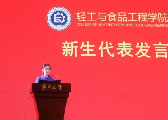 在热烈的掌声中,来自食品科学与工程2024级2班的黄杏雨作为新生代表发表了热情洋溢的讲话,表达了对成长路上默默付出的老师和家人的致敬和感谢,对自己过往的回顾和对未来的憧憬,承诺将秉持校训,与同学们携手前进,以勇气、刚毅和自信迎接挑战,不负青春韶华。
