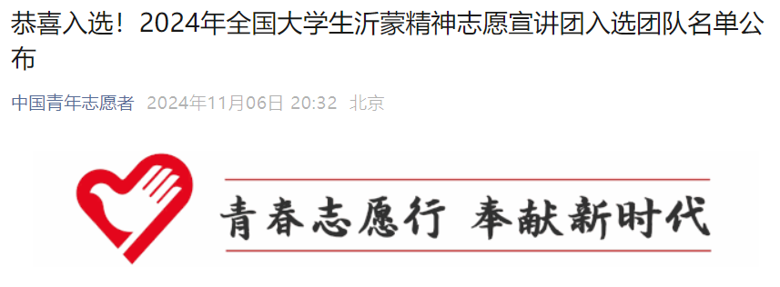 近日,团中央青年志愿者行动指导中心公布2024年全国大学生遵义会议精神宣讲团、2024年全国大学生沂蒙精神志愿宣讲团的入选团队名单,我院“轻”言青语宣讲团成功入选。“轻”言青语宣讲团继2024年3月入选全国大学生延安精神宣讲团后再次入选国家级大学生志愿宣讲团。